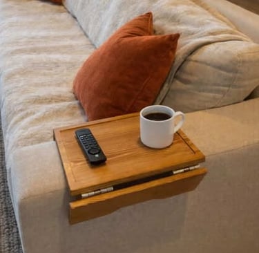 Made by Klavio, this acacia wood clip-on tray mounts securely to sofa arms and adds holders for phones, tablets, drinks, and remotes. This creates a practical side-table surface by keeping essentials organized and within easy reach on the couch.