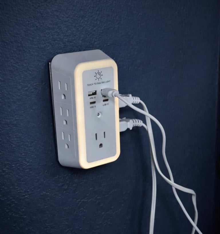 Made by Tullock, this multi plug outlet extender provides seven AC outlets, four USB ports including two USB C, and 1680J surge protection with a built-in night light. This expands a single wall outlet into a spaced power hub that supports organized charging for home, travel, and office use.
