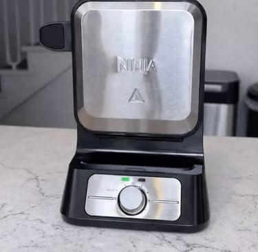 Made by Ninja, this NeverStick PRO Belgian waffle maker uses a vertical design with a precision-pour cup and five shade settings. This creates thick, even waffles by preventing overflow and guiding the batter for clean, consistent cooking.