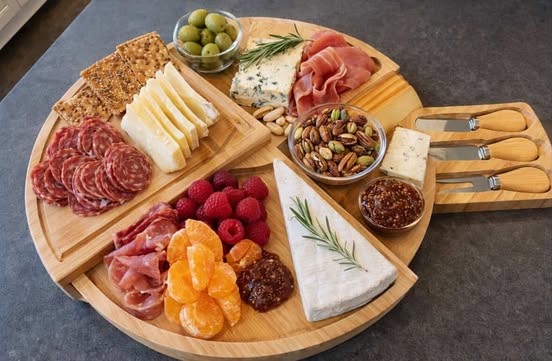 Made by Easoger, this charcuterie board set includes a large wooden serving platter, knife, spreader, and utensils for preparing and serving appetizers and snacks. This makes entertaining easier by giving a complete, ready-to-use setup for cheese, meats, fruits, and shared plates at gatherings.