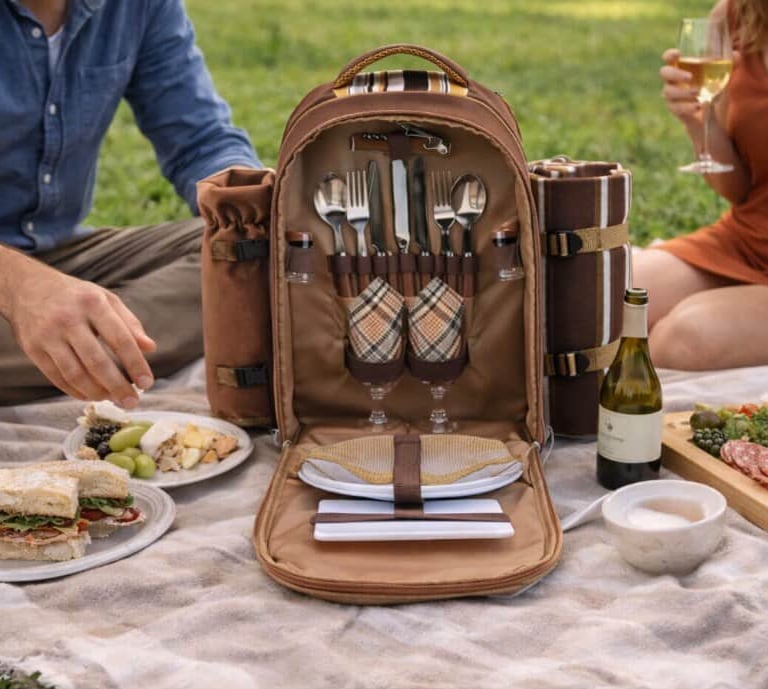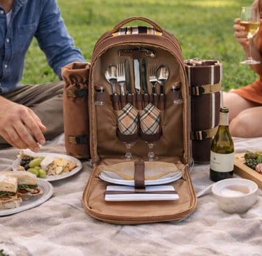 Made by Apollo Walker, this picnic backpack includes a cooler compartment, detachable bottle holder, fleece blanket, plates, and cutlery for two people. This supports outdoor picnics by organizing food, drinks, and essentials into a single easy-to-carry setup.