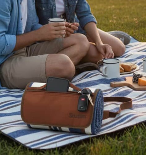 Made by Scuddles, this 60 by 80 inch outdoor picnic blanket features a waterproof dual-layer design that folds into a compact travel mat. This supports beach, park, and camping use by offering sand-free comfort and space for up to four adults.